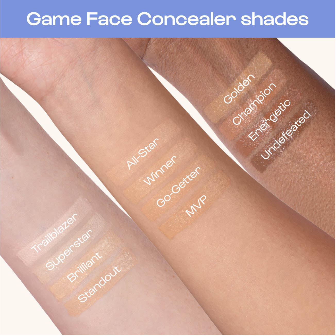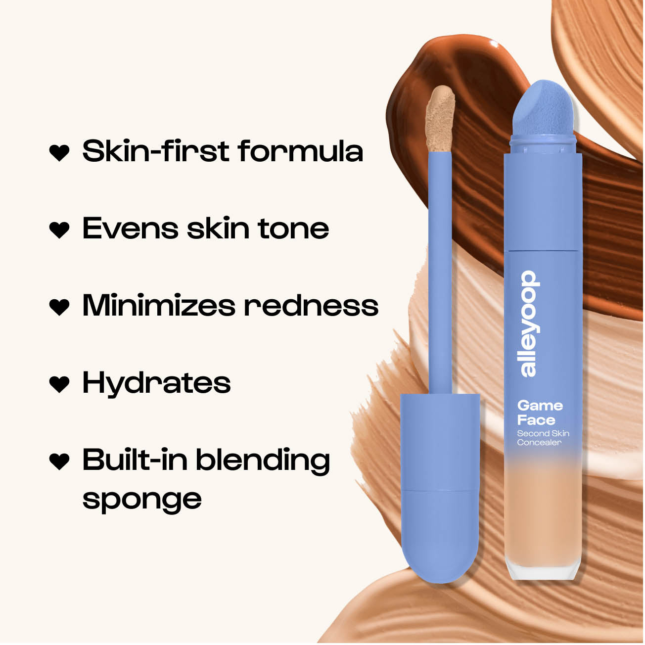 • Game Face Concealer: Our hydrating concealer, featuring skincare ingredients and unstoppable crease-proof performance. Score seamless blending with the built-in sponge for a second-skin finish.